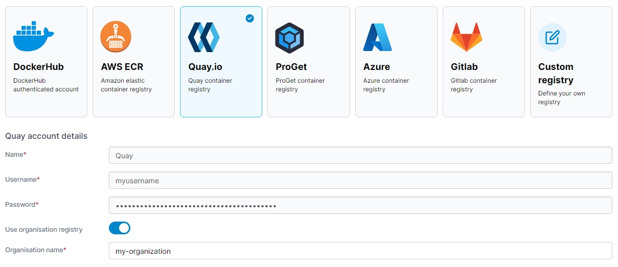 Toggle on if you need to specify the organization to use when connecting to your Quay.io registry.