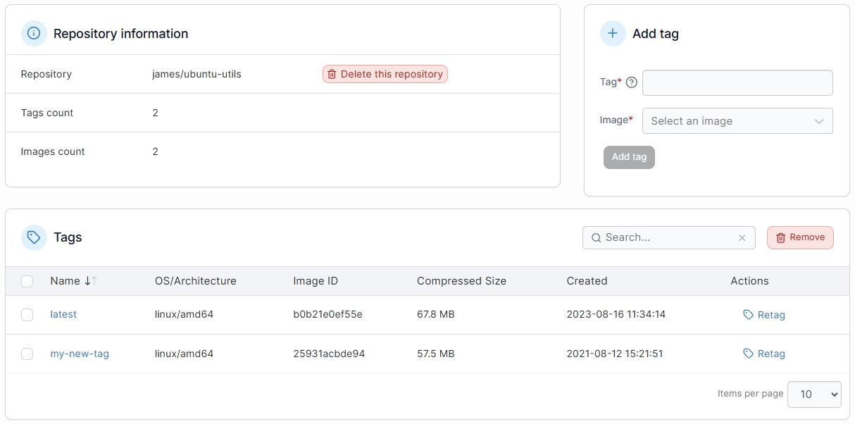 The Repository information page provides the repository name, tag and image count, as well as a list of all tags. You can retag an image in order to promote it through the deployment lifecycle, or simply add or remove tags to annotate changes or usage.