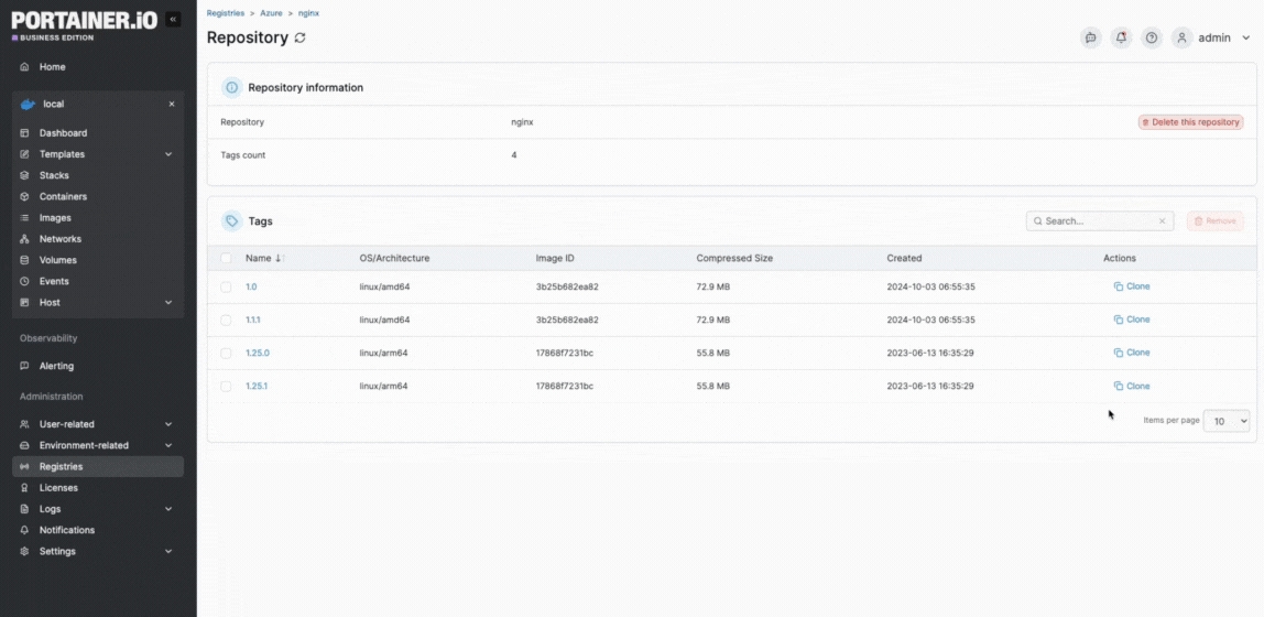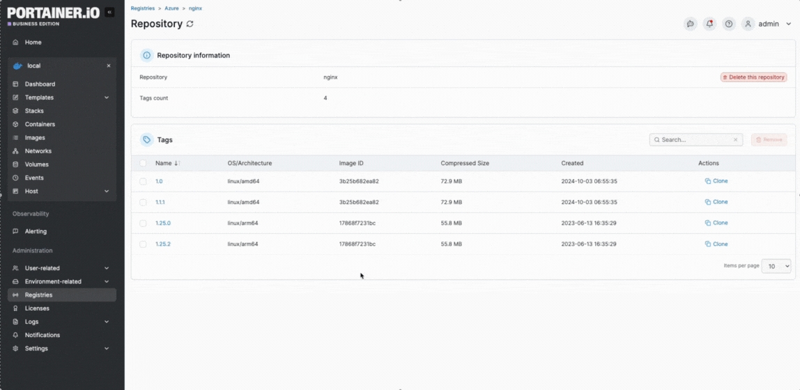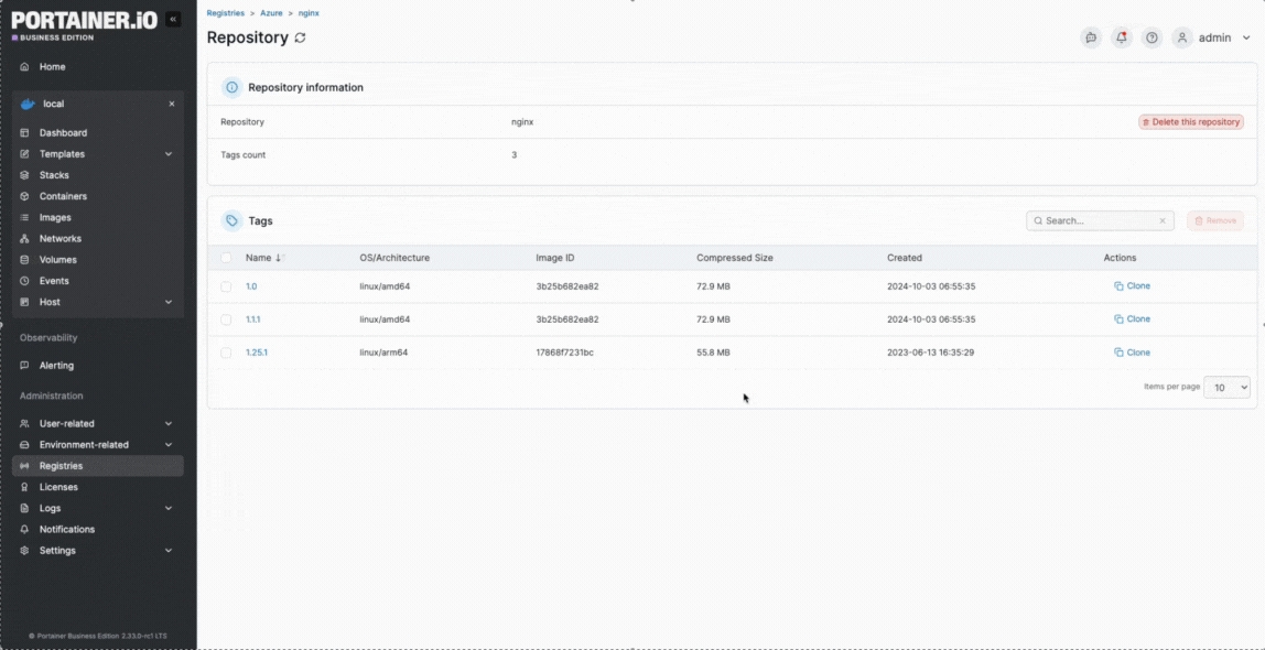 From the menu select Registries, choose the registry you want to manage and click browse. From the list of repositories, select the repository you want to manage.