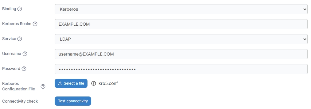 When using the Kerberos binding, the following options are displayed:
