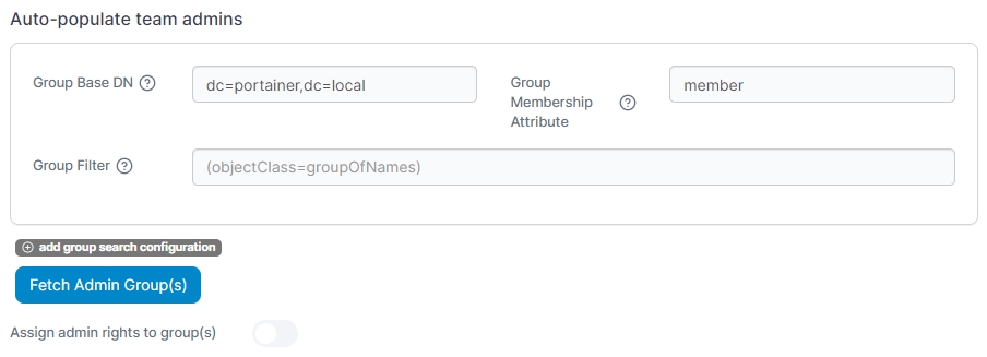 If desired, Portainer can configure specified AD groups of users to become Portainer administrators automatically.