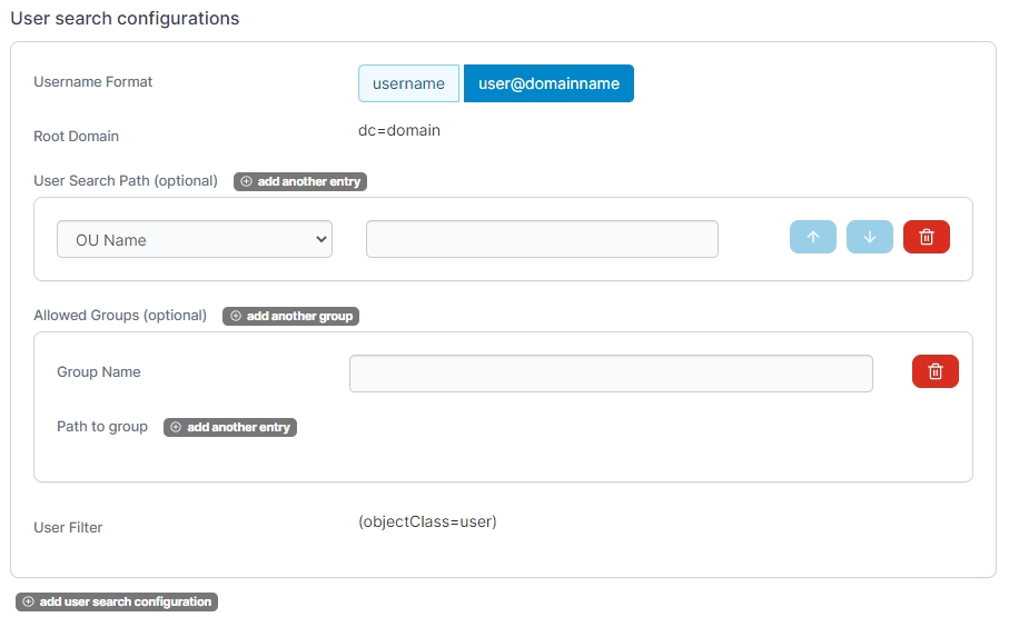 Configure the user search configurations using the table below as a guide. Click add user search configuration to set up multiple configurations.
