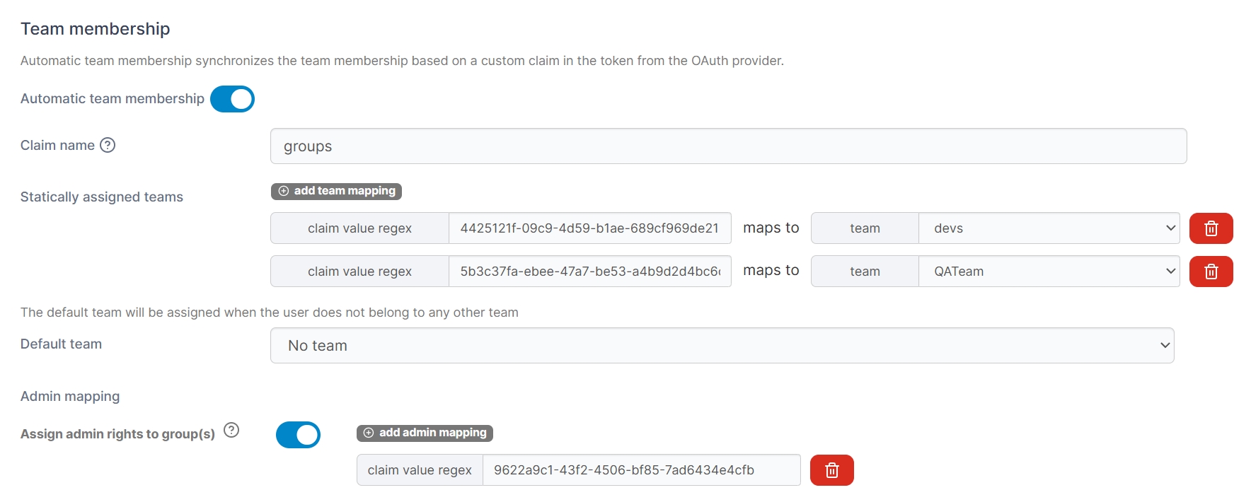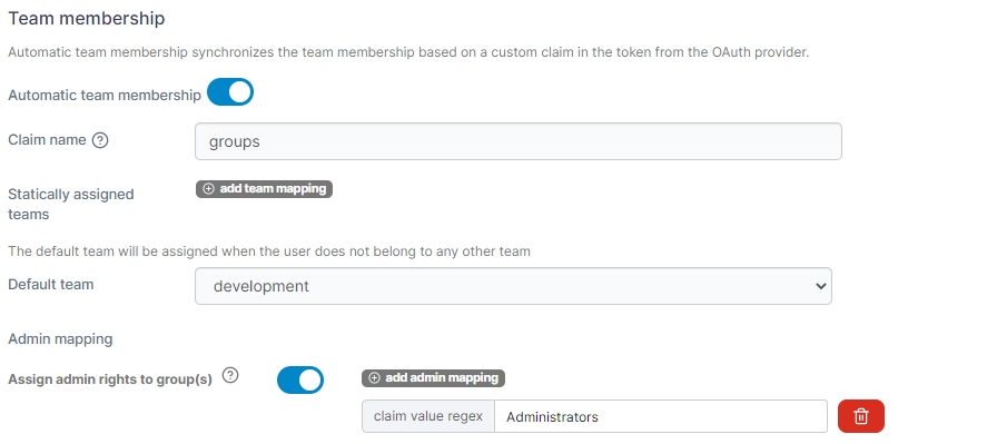 If you toggle Automatic team membership on, you can choose to automatically add OAuth users to certain Portainer teams based on the Claim name. Claim names will be matched with teams or you can manually link a claim name (using regex) with Portainer teams under the Statically assigned teams option. You can also define a Default team for users who don't belong to any other team.