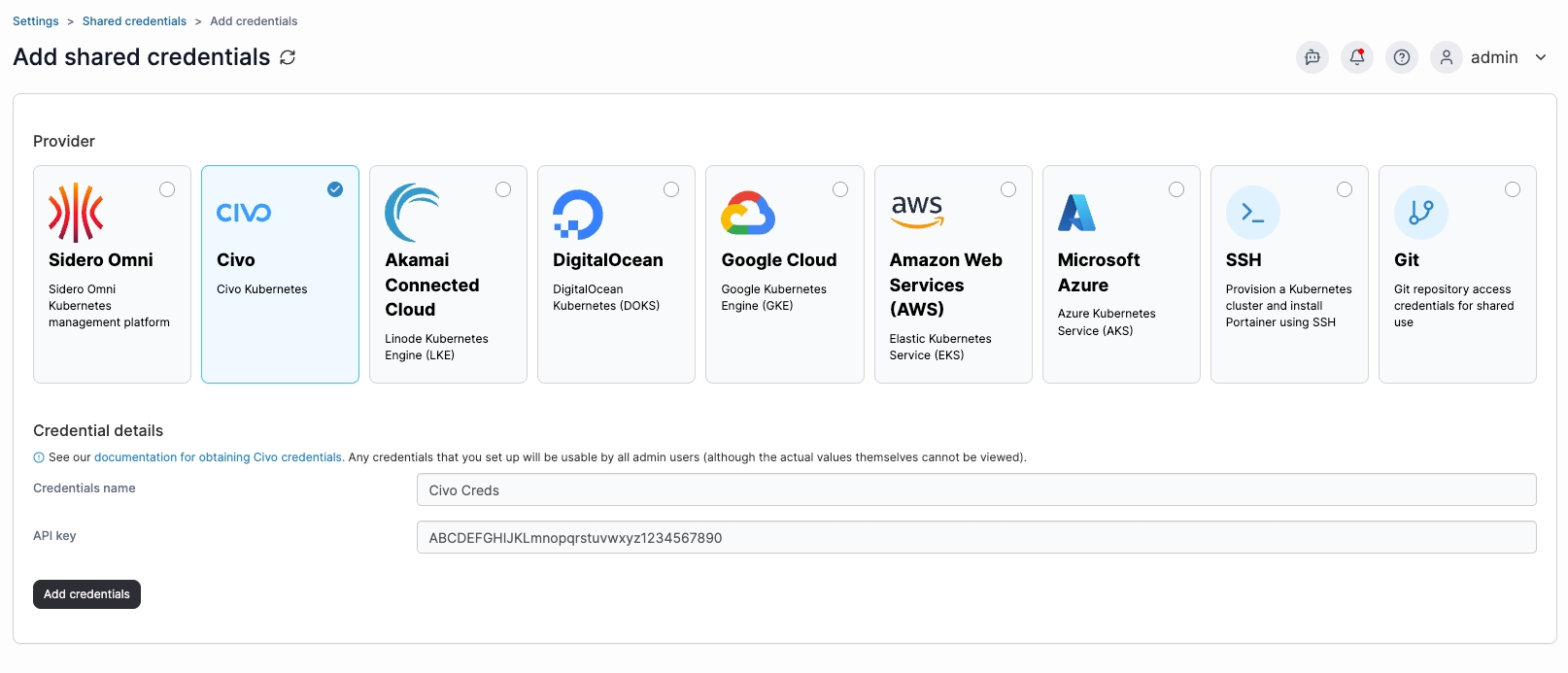 To add credentials for a Civo account, from the Shared credentials page click Add credentials, then select the Civo option. Give your credential set a name and paste your API key into the box.