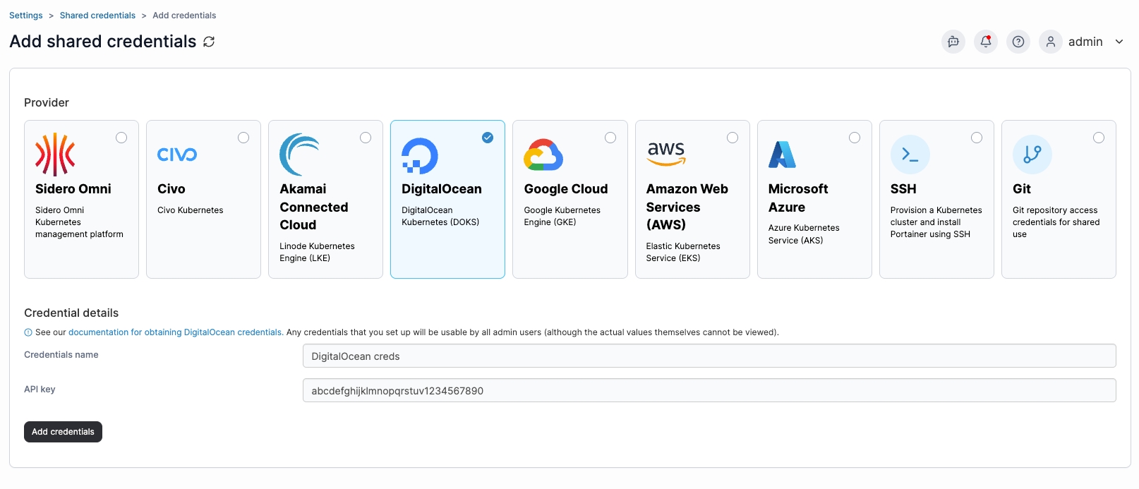 To add credentials for a DigitalOcean account, from the Shared credentials page click Add credentials, then select the DigitalOcean option. Give your credential set a name and paste your API key into the box.