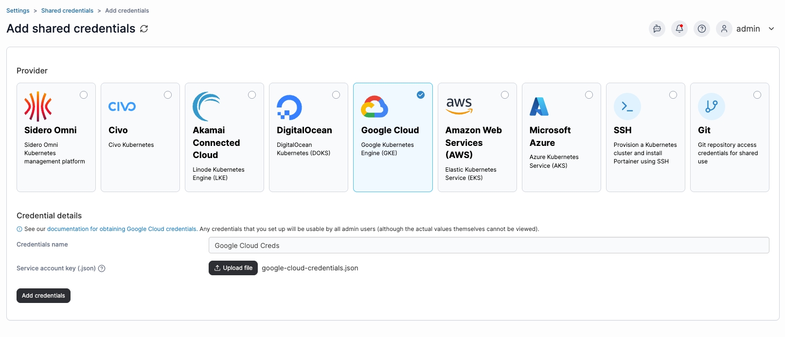 When you're ready, click Add credentials. Your credentials will now be available to you when provisioning a Kubernetes cluster on Google Cloud.