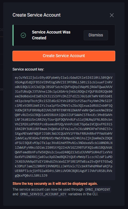 onictl serviceaccount create portainerThis will create a service account named portainer with a lifetime of 1 year and with the same role as the user that created it. The command will output the OMNI_ENDPOINT and OMNI_SERVICE_ACCOUNT_KEY values - note both of these as you will need them in the next step.
