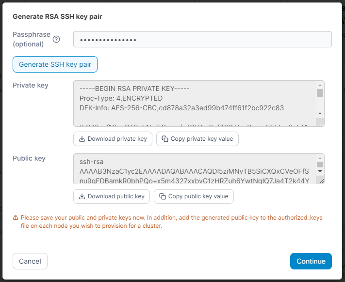Once you have saved the public and private key files, click Continue. You will be returned to the previous screen and the SSH private key passphrase and SSH private key fields will be populated with your new key pair's passphrase and private key respectively.
