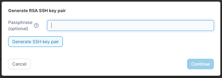 If you would like to create a new key pair for your SSH credentials, you can do so by clicking Generate new RSA SSH key pair. You will first be prompted to enter an optional passphrase for your private key, then click the Generate SSH key pair button to proceed.