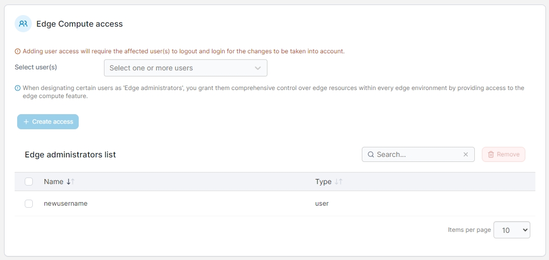 To add a user as an Edge Administrator, select the username from the Select user(s) dropdown and click Create access.
