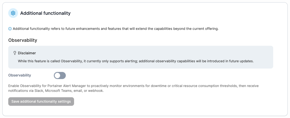| Observability | <p>Toggle this on to enable the Observability feature which is avaliable under <strong>Additional Functionality</strong> in the left hand menu.<br>This feature is currently limited to alerting, with additional observability capabilities to be introduced in future updates.</p> |