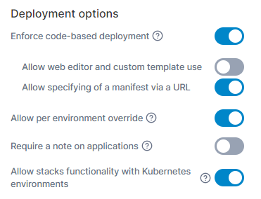 | Allow stacks functionality with Kubernetes environments | Enable this to allow grouping of Kubernetes deployments into "stacks", helping to organize and manage related workloads. Disabling this option will hide the stacks functionality on your Kubernetes environments. |