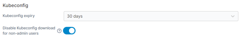 Here you can select the expiry time for [exported kubeconfig files](https://docs.portainer.io/sts/user/kubernetes/kubeconfig) from this dropdown. The new expiry time will only apply to configurations created after this value was changed. Administrators are also able to disable Kubeconfig download for non-admin users here.
