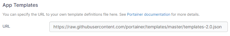 You can deploy containers and services using Portainer's set of built-in app templates, or [replace them with your own](https://docs.portainer.io/sts/advanced/app-templates/build) set of templates. Once you have a JSON file containing the template definitions, you can provide the URL to it here.