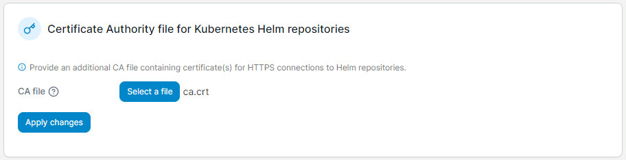 This section lets you supply a certificate authority (CA) file for use with HTTPS connections to Helm repositories from Portainer. This is useful if the TLS certificate your Helm repository uses is signed by a custom CA, and applies to both the Helm Repository configured above and to Helm repositories configured per environment.