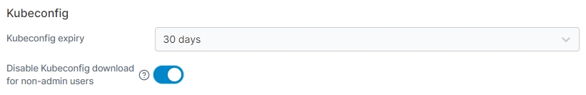 Here you can select the expiry time for exported kubeconfig files from this dropdown. The new expiry time will only apply to configurations created after this value was changed. Administrators are also able to disable Kubeconfig download for non-admin users here.