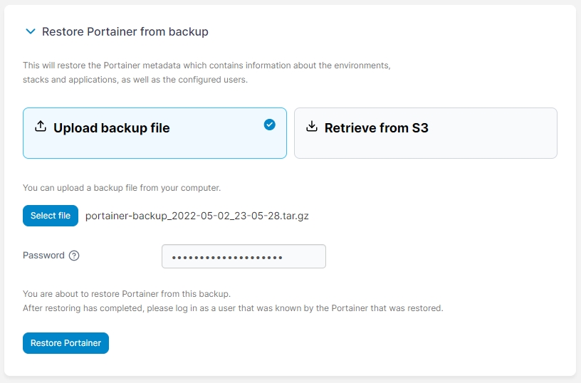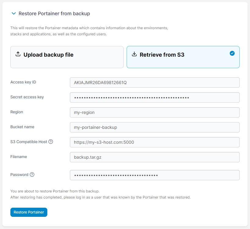 Restoring a configuration is only possible on a fresh instance of Portainer during the initial installation. When you need to restore Portainer, deploy a fresh instance of Portainer with an empty data volume and choose the Restore Portainer from backup option during setup, making sure to select Retrieve from S3. Complete the fields using the table below as a guide.