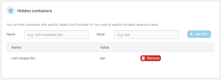 Stops a container from appearing in the Portainer UI through the container label. Enter the name and value of the label, then click Add filter. Containers with matching labels will be hidden.