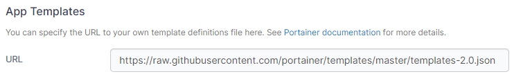 You can deploy containers and services using Portainer's set of built-in app templates, or replace them with your own set of templates. Once you have a JSON file containing the template definitions, you can provide the URL to it here.