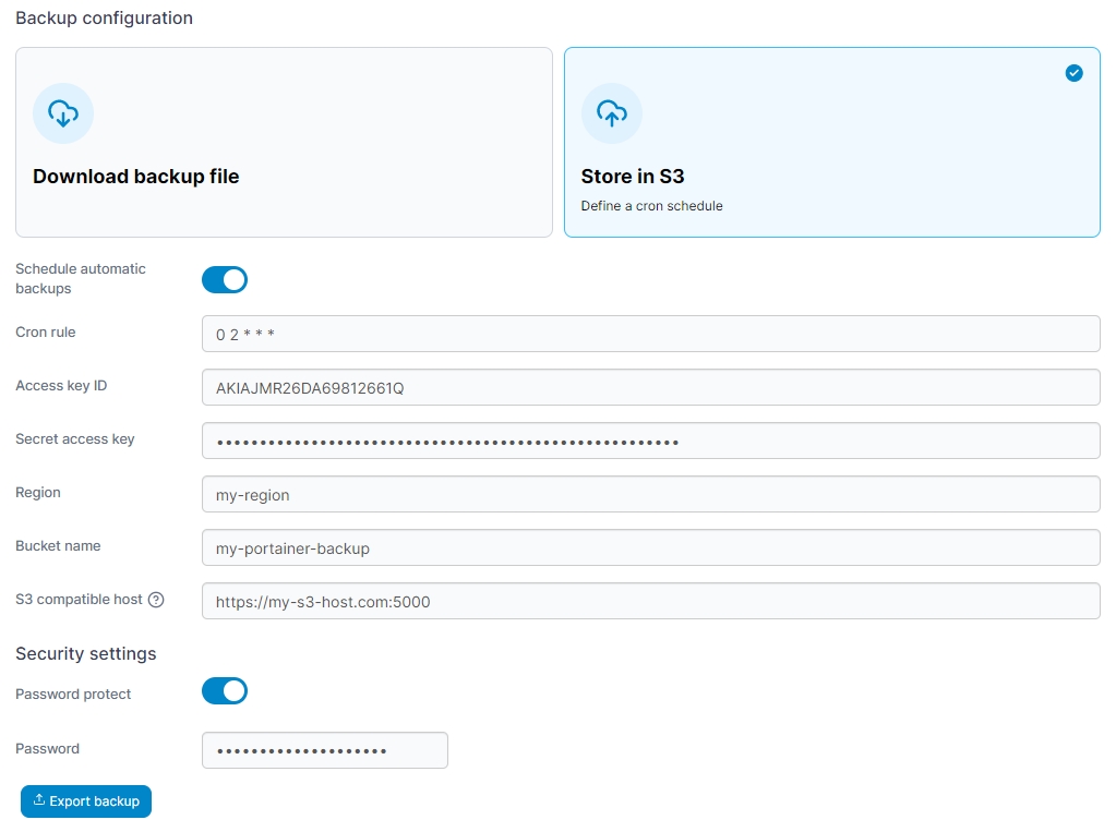 With Portainer Business Edition you have the option to store a backup of your configuration in an S3 bucket, either on demand or on a defined schedule.