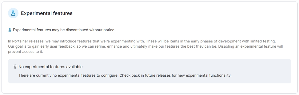 This section allows you to enable experimental Portainer features for use in your deployment. These features are in early development and have gone through a limited set of testing, and are provided to users in order to gather feedback on the feature at an earlier stage of development.