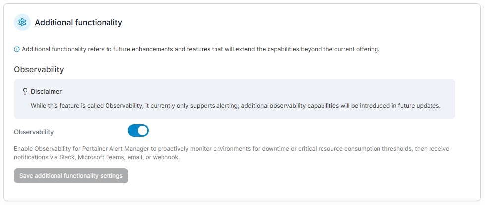 This section contains options for enabling and configuring additional functionality within Portainer.