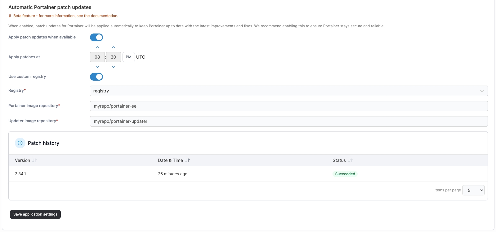 Toggle Apply patch updates when available to enable your Portainer version to be automatically updated when a new patch is released. Automatic updates will only apply to patches, for example from 2.35.0 to 2.35.1. Your Portainer version will not automatically update with major or minor releases (2.35.0 to 2.36.0 for example).