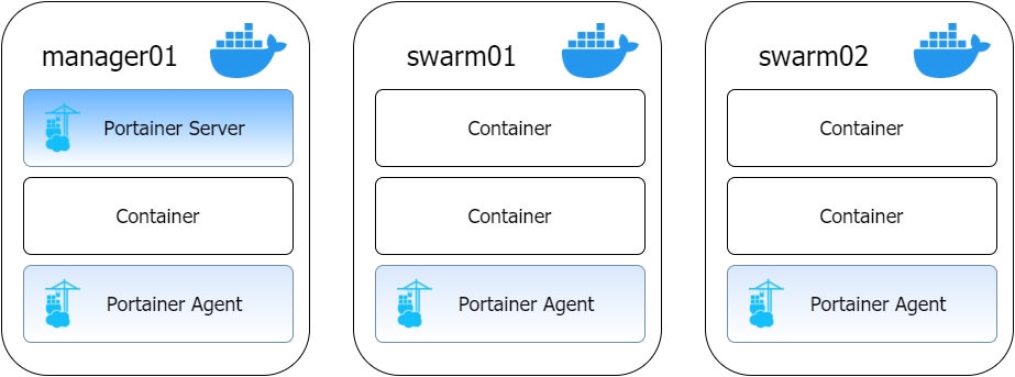 Now, for Docker Swarm let's imagine a setup with one manager node (manager01) and two worker nodes (swarm01 and swarm02):