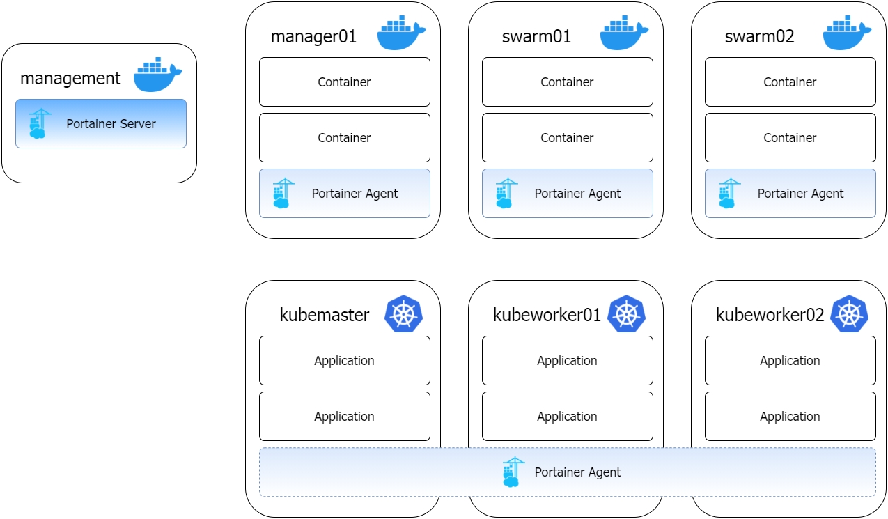 But what if you're running multiple environments? Let's combine what we have above into something more complex: one "management" server (running Docker Standalone) that manages a three node Docker Swarm and a three node Kubernetes cluster: