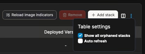 Within the environment that you want to associate your orphaned stacks with, click Stacks in the left hand menu. At the Stacks list, click on the three dots in the top right corner and select Show all orphaned stacks. Your stack list will then update to include any orphaned stacks.