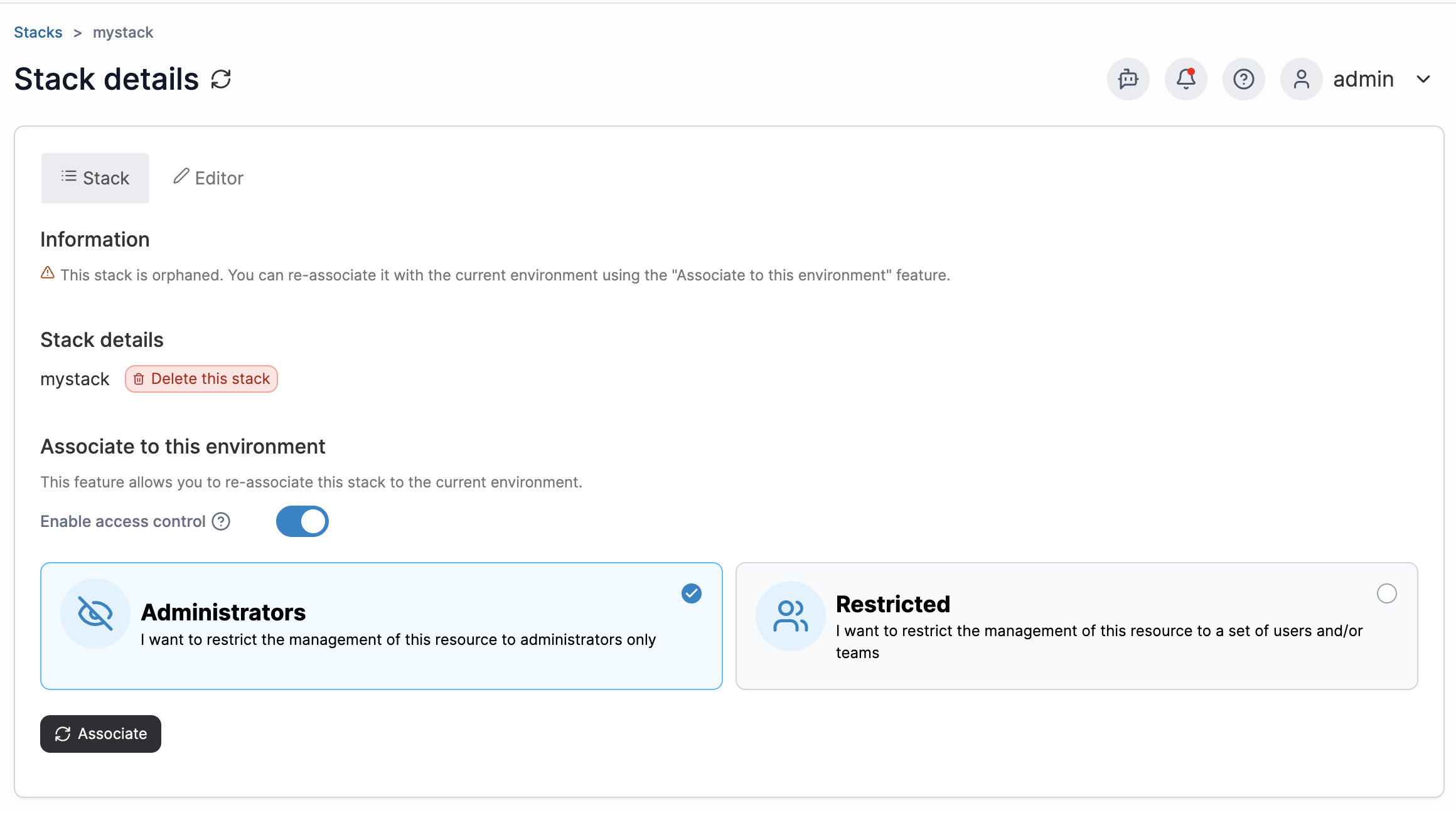 Click into the stack that you want to recover, and select **Associate.**