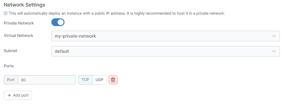 When Private Network is enabled, select the subnet to use within your network (where relevant).