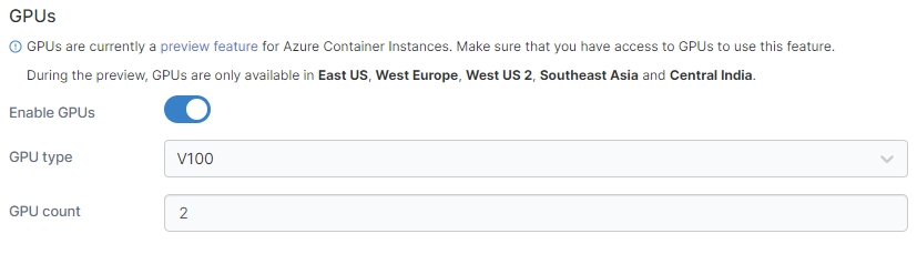 GPUs are currently a preview feature for Azure Container Instances and only available in select locations. Ensure you have access to GPUs before using this feature.