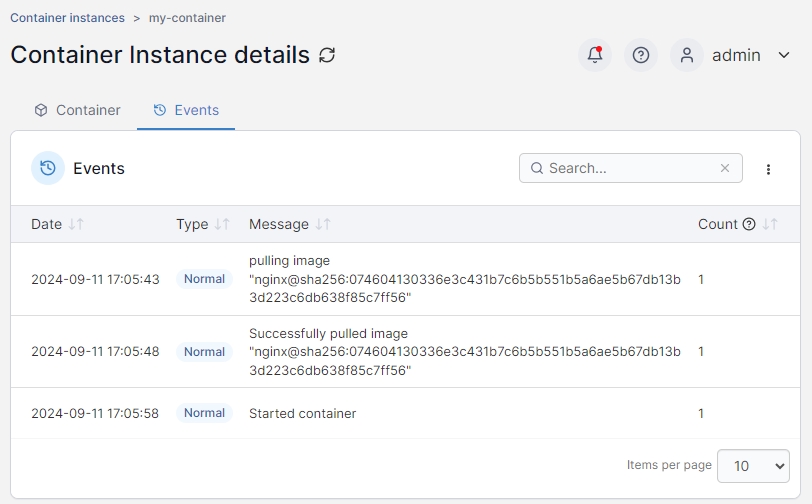Events can be sorted by date, type, message and count (the number of times the event has fired) and can be filtered from the search box.