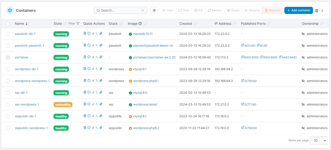 Add a new containerOnce a container has been created you can inspect it, edit or duplicate it, toggle a container webhook, attach volumes, view logs and statistics, edit ownership, and access its console.