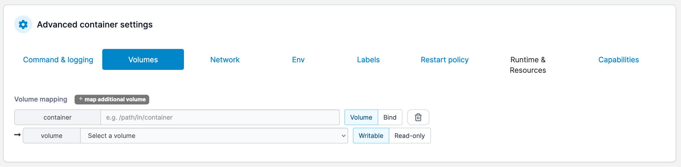 Scroll down to Advanced container settings. Click Volumes then click map additional volume.