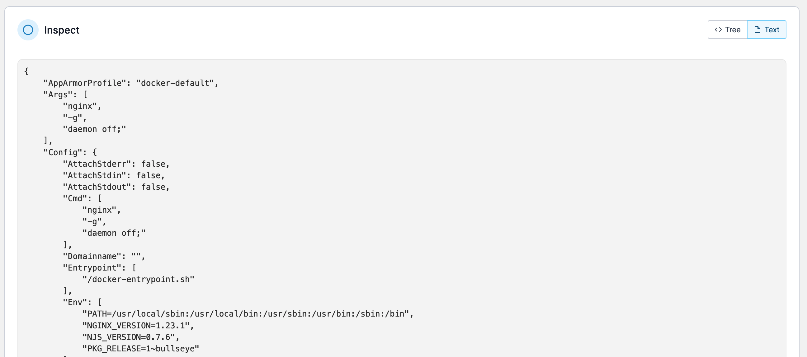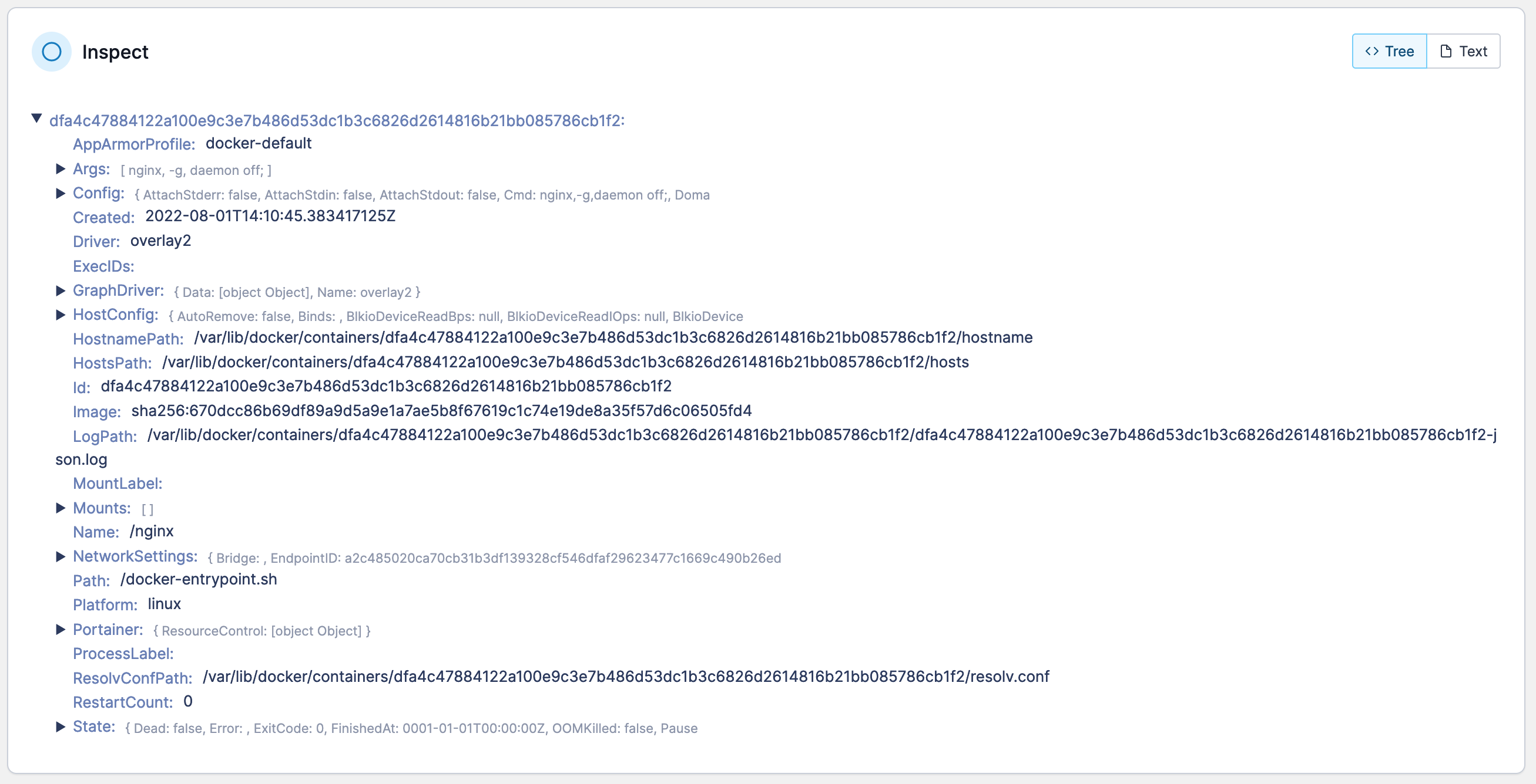 You can also inspect the container in a raw JSON format by clicking **Text**.