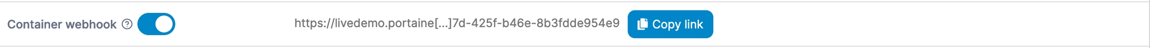 In the Container details screen toggle the Container webhook option on. When the URL appears, click Copy link. This URL will be used to configure the webhook in your chosen registry.