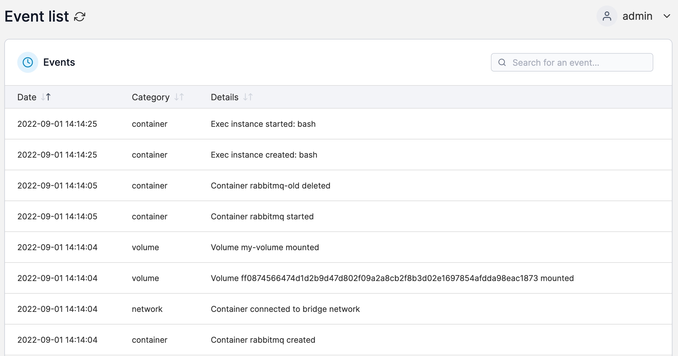 The Events section in Portainer lists container events that have occurred. You can filter the list using search, and you can also view more information about each container.