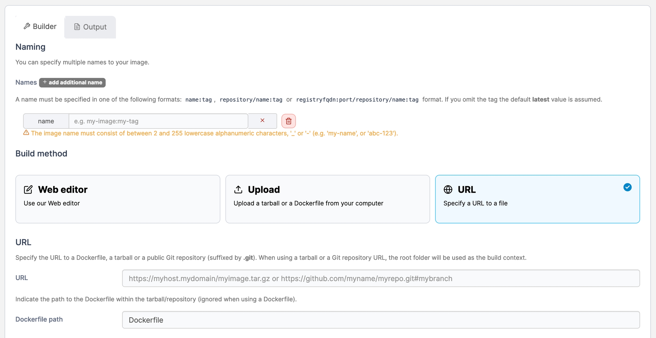 Next, give the image a descriptive name (you can enter multiple names), select the Upload option under Build method, then enter the URL of the file and the Dockerfile path within the tarball or repository.