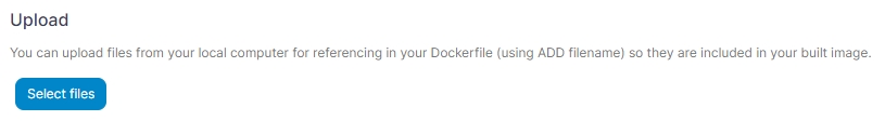 Optionally, you can upload one or more local files to be included in an image by clicking Select files and selecting the files to include. You can then reference them in your Dockerfile.