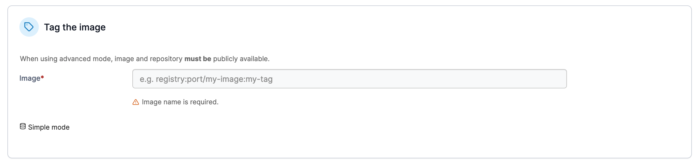If you wish to tag the image with a registry that is not configured within Portainer, click **Advanced mode** and enter the registry, port, image and tag as required.