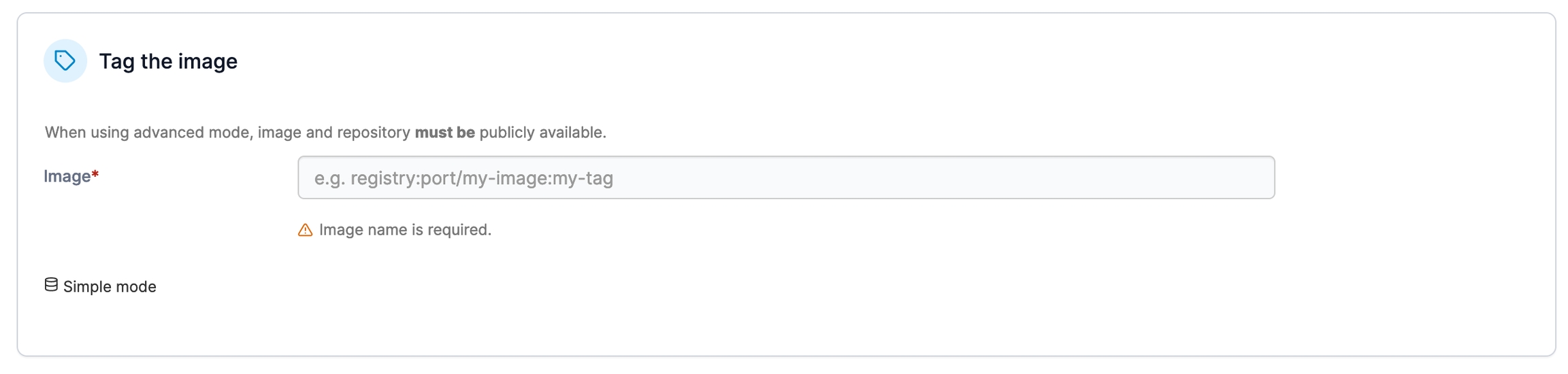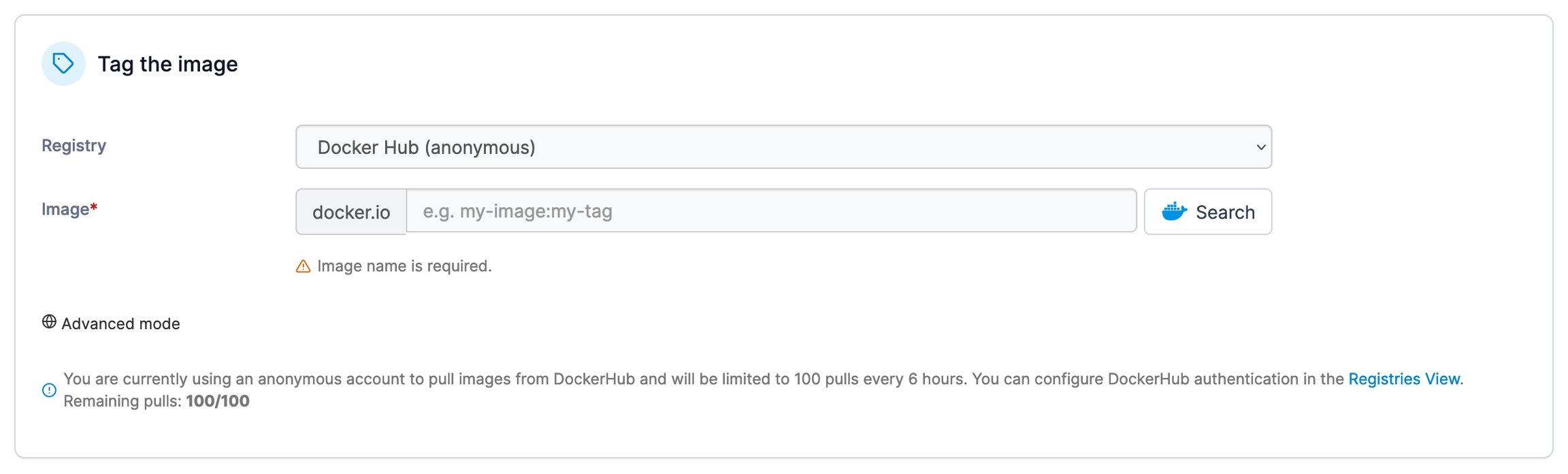 If you wish to tag the image with a registry that is not configured within Portainer, click Advanced mode and enter the registry, port, image and tag as required.
