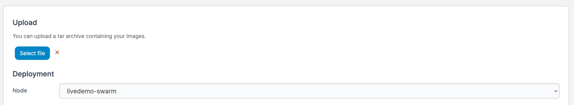 Click Select file to browse for the image file to upload. Portainer supports .tar, .tar.gz, .tar.bz2 and .tar.xz files. If you are on a multi-node environment, select the node where you wish to save the image.