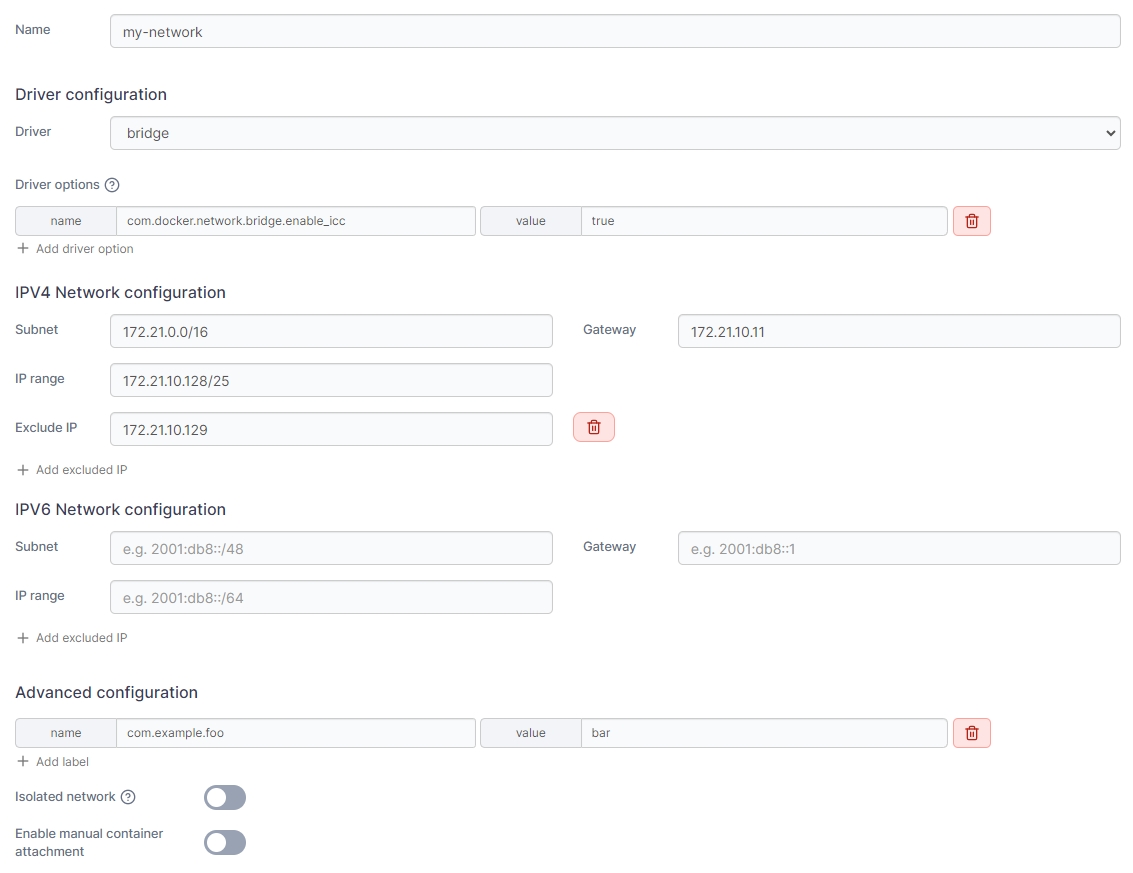 Define IPv4 range, subnet, gateway and exclude IP. If no information is entered here, Docker will automatically assign an IPv4 range. If you need to exclude IPs from the range, click Add excluded IP and complete the field.