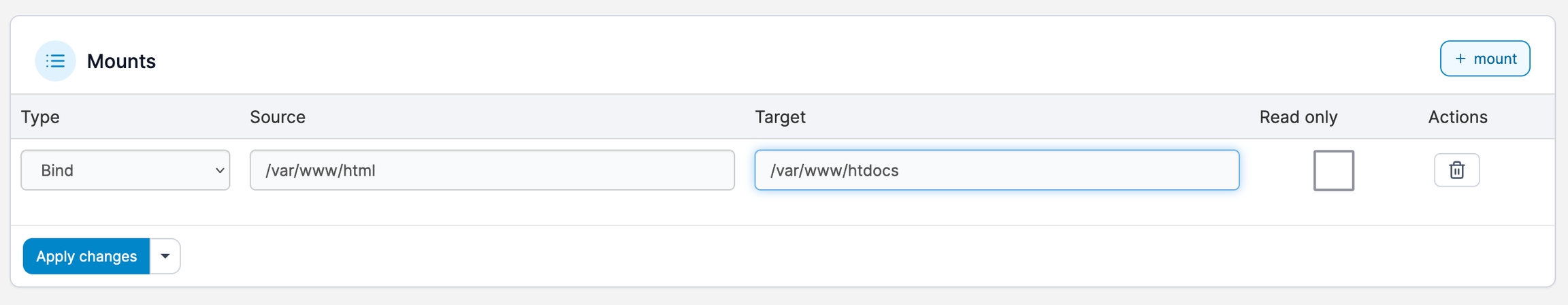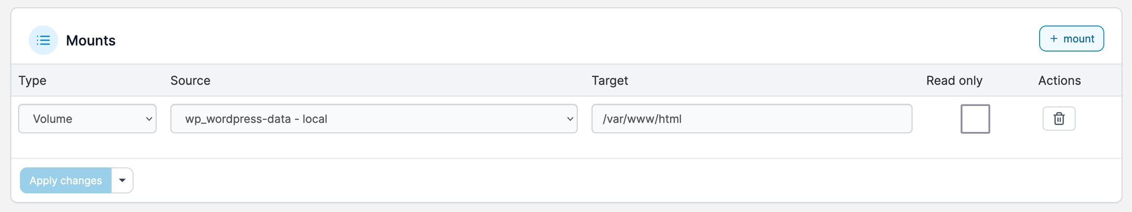Select the volume from the Source dropdown, enter the container path in the Target field tick Read only if required then click Apply changes.