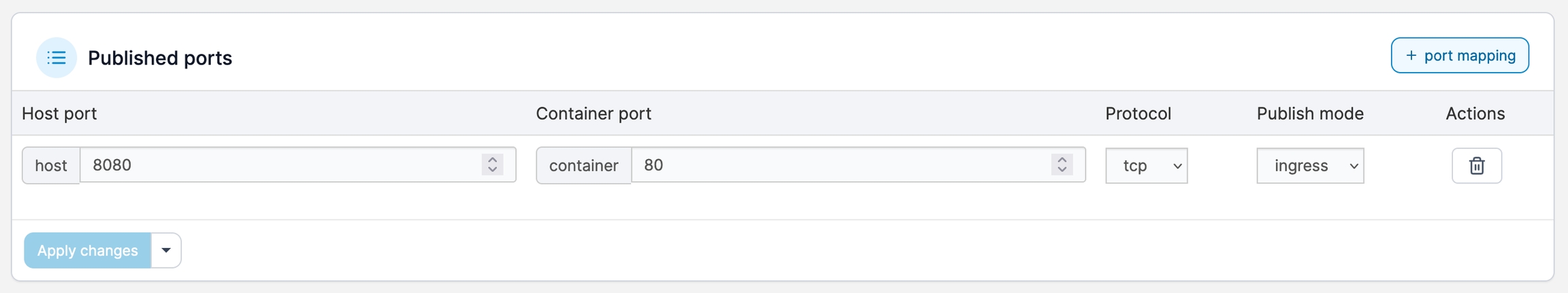 Use this setting to publish ports so they can access a container from outside of the host. You can either add new ports or update existing ports.