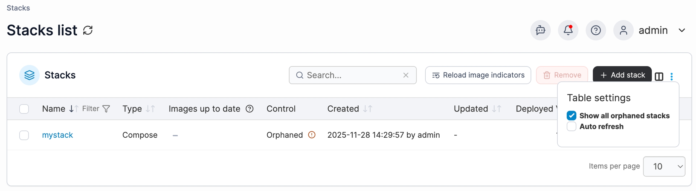 Within the Stack list, you’ll see all stacks that have been previously created in the selected environment. If an environment is deleted, any stacks that belonged to it become orphaned. To display any orphaned stacks, click the three dots in the top right corner and select Show all orphaned stacks, the stack will need to be re-associated to be fully recovered.