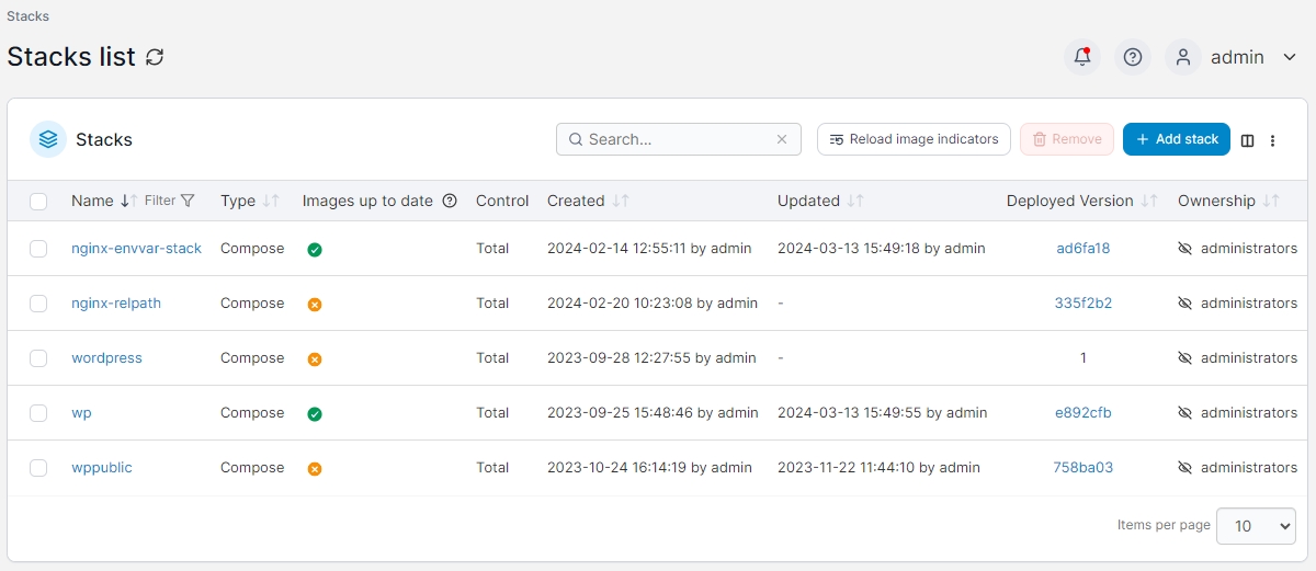 When the new image indicator feature is enabled, the Images up to date column indicates whether the local images in the stack are up to date, with a green tick indicating they are up to date and an orange cross indicating that there is a newer version of an image available at the remote registry. A grey hyphen indicates Portainer was unable to determine whether there is an update available for the images.