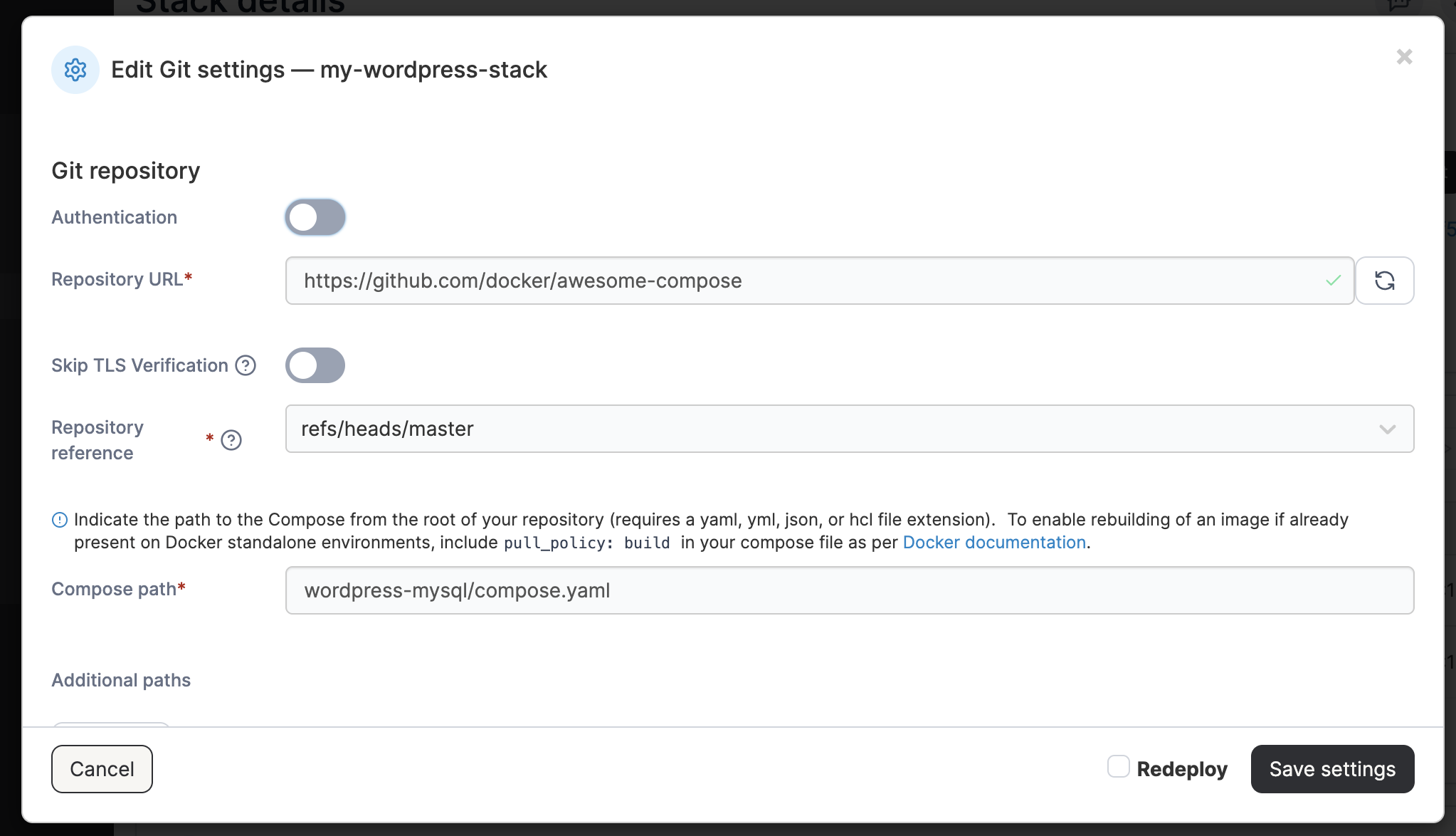 Check **Redeploy** if you would like the stack to redeploy on saving. Click **Save settings** when you are done.